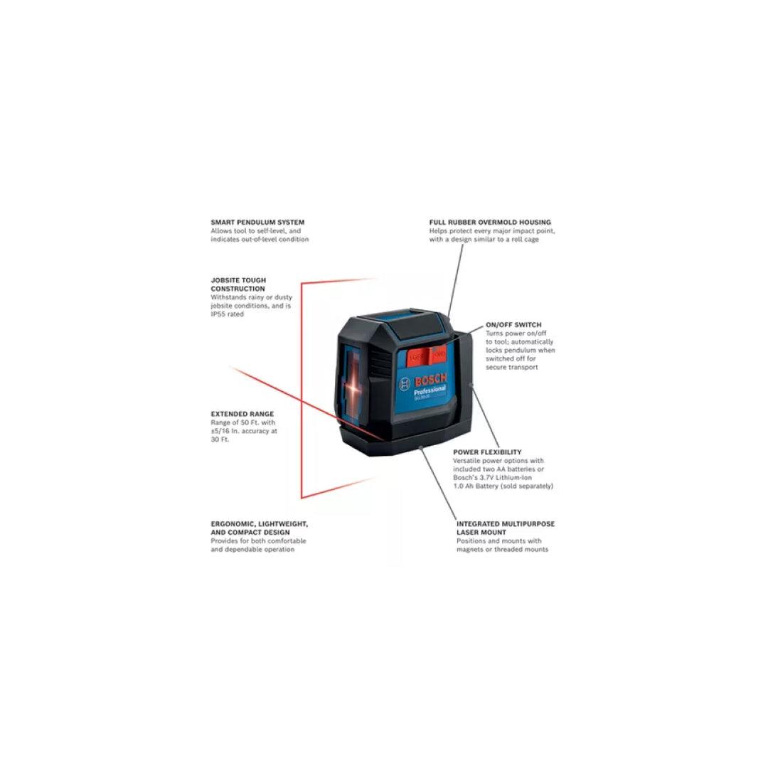 The Bosch GLL50-20 Self-Leveling Cross-Line Laser features a 50 Ft. range and cross-line mode that projects both horizontal and vertical red lines, allowing for leveling with a 5/16 In. accuracy at 30 Ft. With its power flexibility, operate using the included AA batteries or purchase Bosch's 3.7V Lithium-Ion 1.0 Ah Battery (sold separately) that allows use of the tool while charging to diminish downtime. Its ergonomic, compact, lightweight design and IP55 dust- and water-resistant rating provide for both comfortable and dependable operation. The full rubber overmold housing helps protect every major impact point, acting like a roll cage for safeguarding. Equipped with a Smart Pendulum System, the tool self levels, will indicate any out-of-level condition by blinking and then locks when switched off for secure transport. Simply tilt the laser to use the lines at an angle with ease. Position the tool with the included integrated magnetic mount or utilize the 1/4 In. threading mount that fits with like-sized tripods.