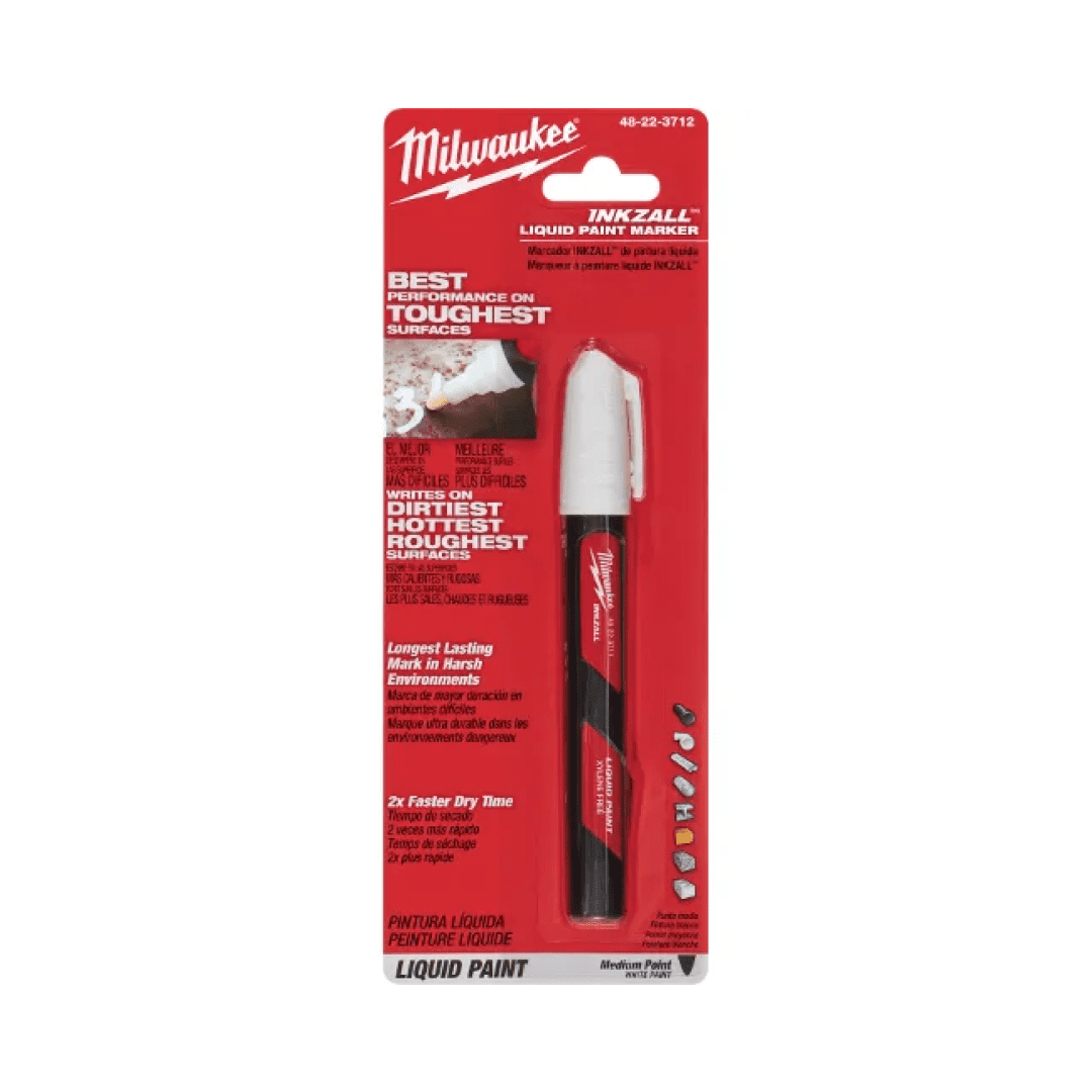 Milwaukee INKZALL® Liquid Paint Markers were designed from the ground up to provide users with the best performance on tough jobsite surfaces. All INKZALL®Liquid Paint Markers feature a durable acrylic nib that can write on the dirtiest, hottest and roughest of surfaces. Proprietary paint developed specifically for INKZALL™ Liquid Paint Markers can mark on surfaces up to 300F and dries in 10 seconds. For the most demanding environmental conditions, INKZALL® Liquid Paint Markers provide the longest lasting marks that are both water and UV resistant.