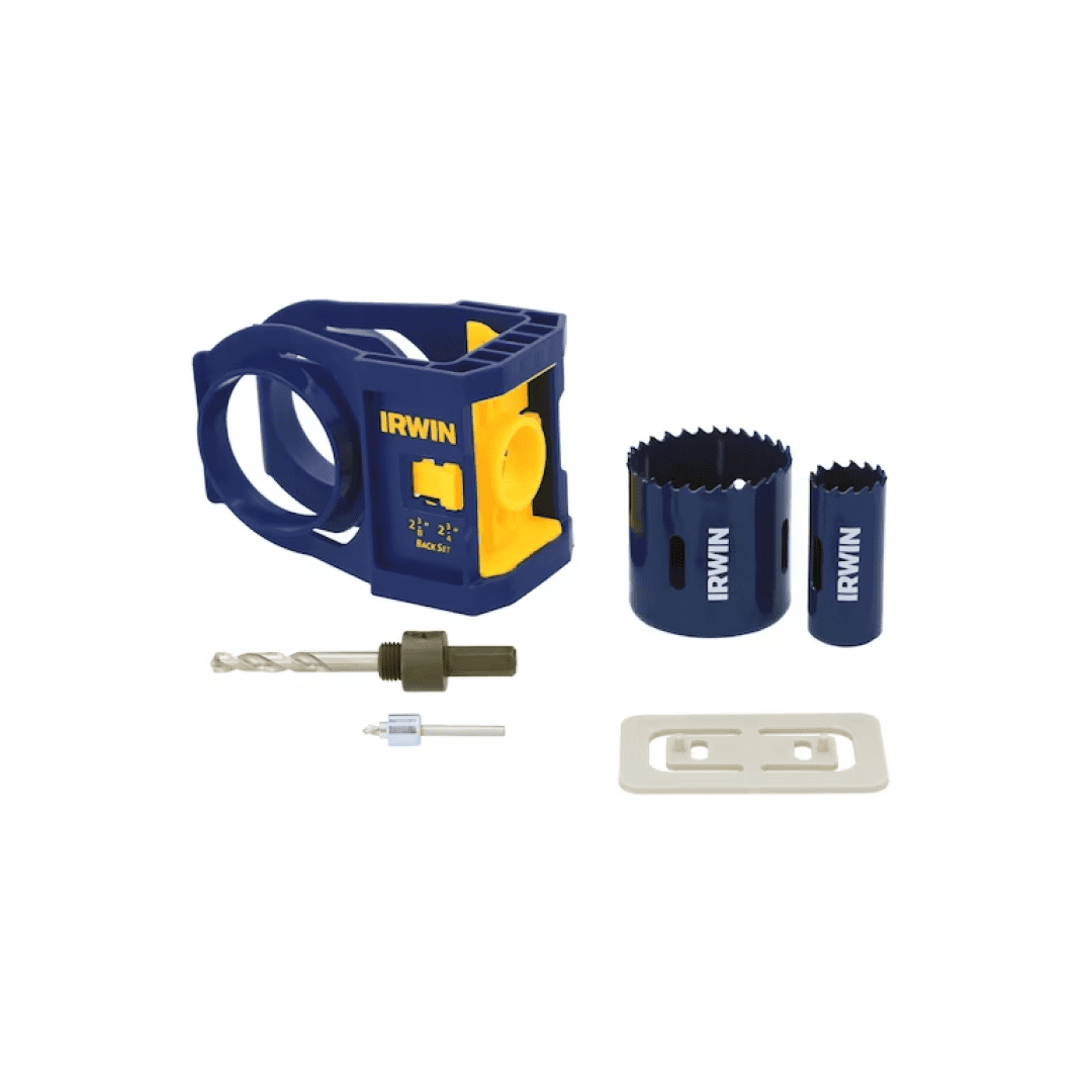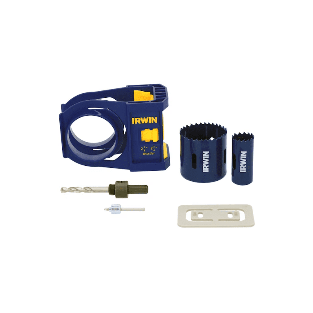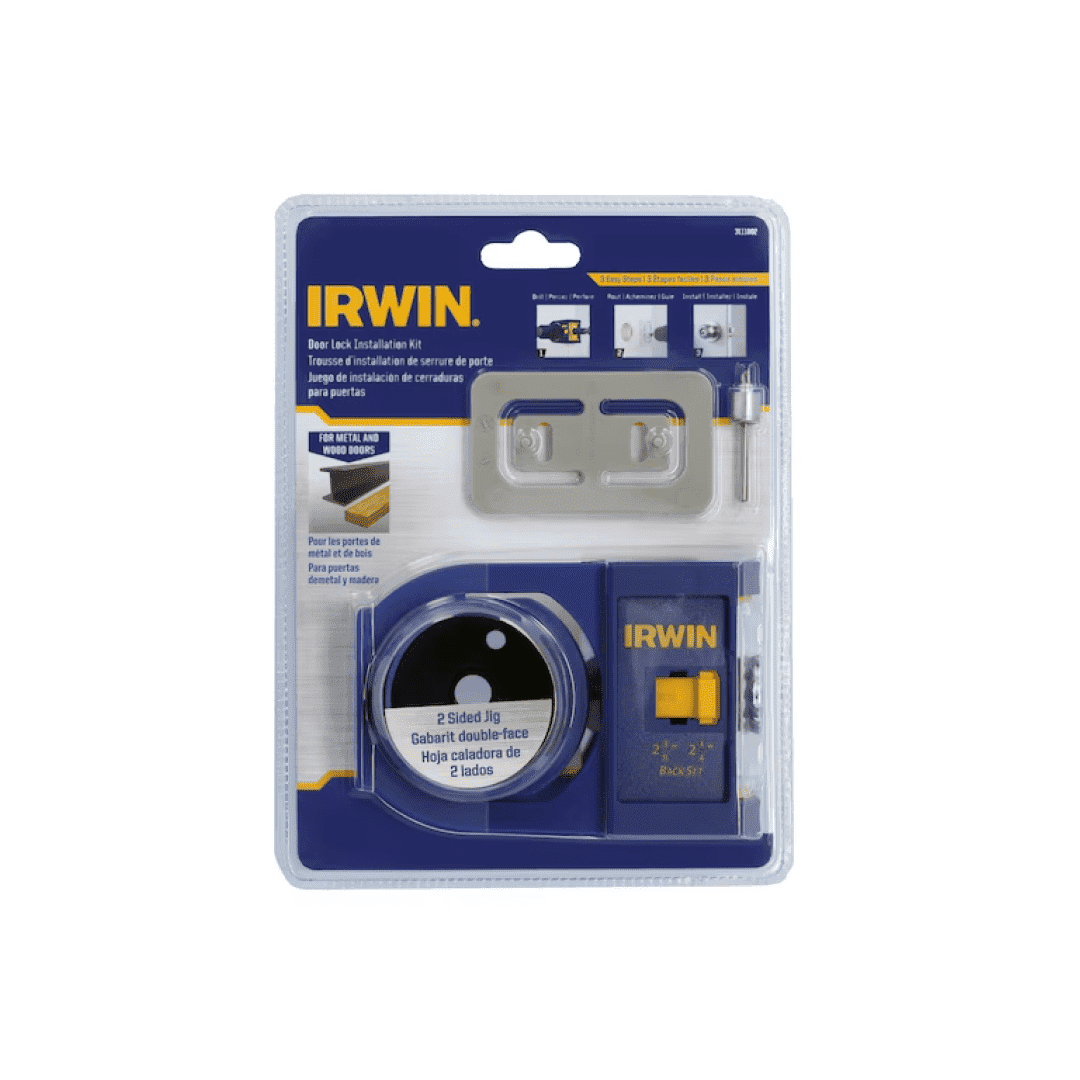 The IRWIN® Wood & Metal Door Lock Installation Kit uses durable carbon hole saws to cut openings in interior and exterior wooden doors for installing lock and handle sets in four easy steps. With a self-centering jig adjustable for 2-3/4" and 2-3/8" backsets that fits all common door widths, it makes precisely installing a door handles and locksets in any blank door fast and simple.