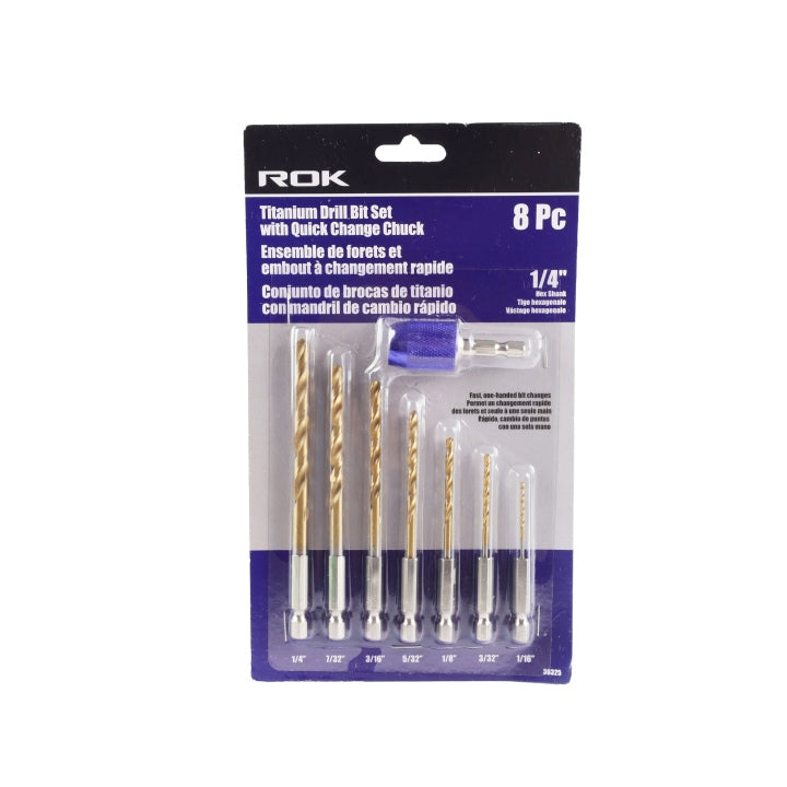 Titanium Drill Bit Set With Quick Change Chuck 1/4" Hex Chank 8pc