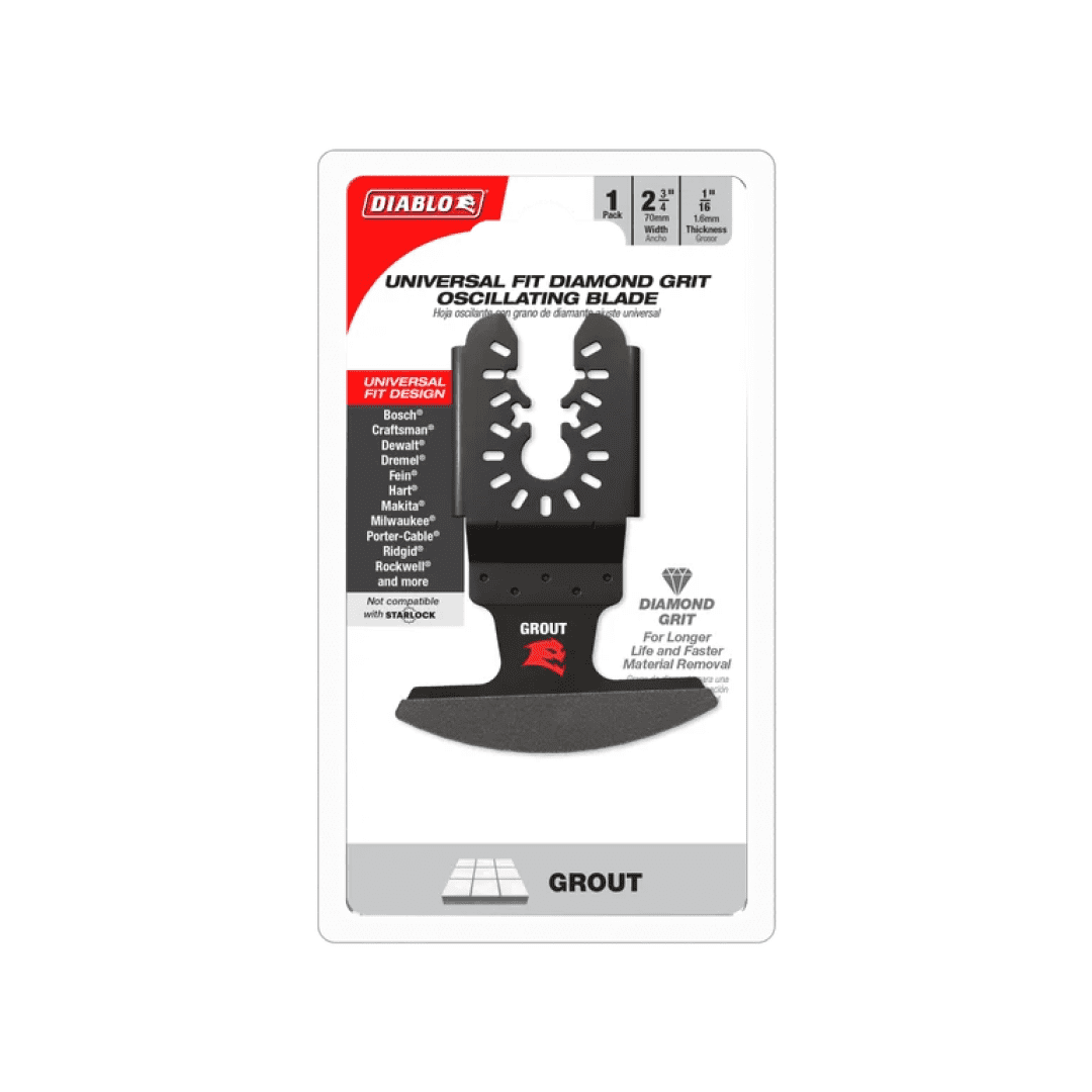 Diablo’s universal fit diamond grit oscillating blades feature application specific designs that deliver maximum durability and longer life grout removal applications. An optimized blade design delivers faster material removal in hard to reach areas. The blade’s universal fit, adapter-free design easily attaches most tools, with the exception of Starlock tools.