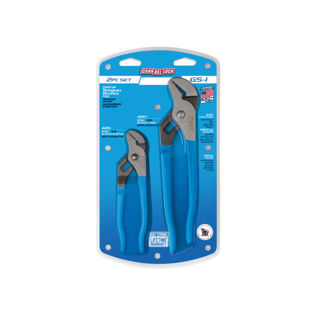 CHANNELLOCK® Straight Jaw Tongue and Groove Pliers are built to last with a PERMALOCK® fastener to eliminate nut and bolt failure, patented reinforcing edge to minimize stress breakage and laser-hardened teeth to provide a better, longer lasting grip. CHANNELLOCK® Straight Jaw Tongue and Groove Pliers are made in USA and forged from high carbon steel that is specially coated for ultimate rust prevention.
