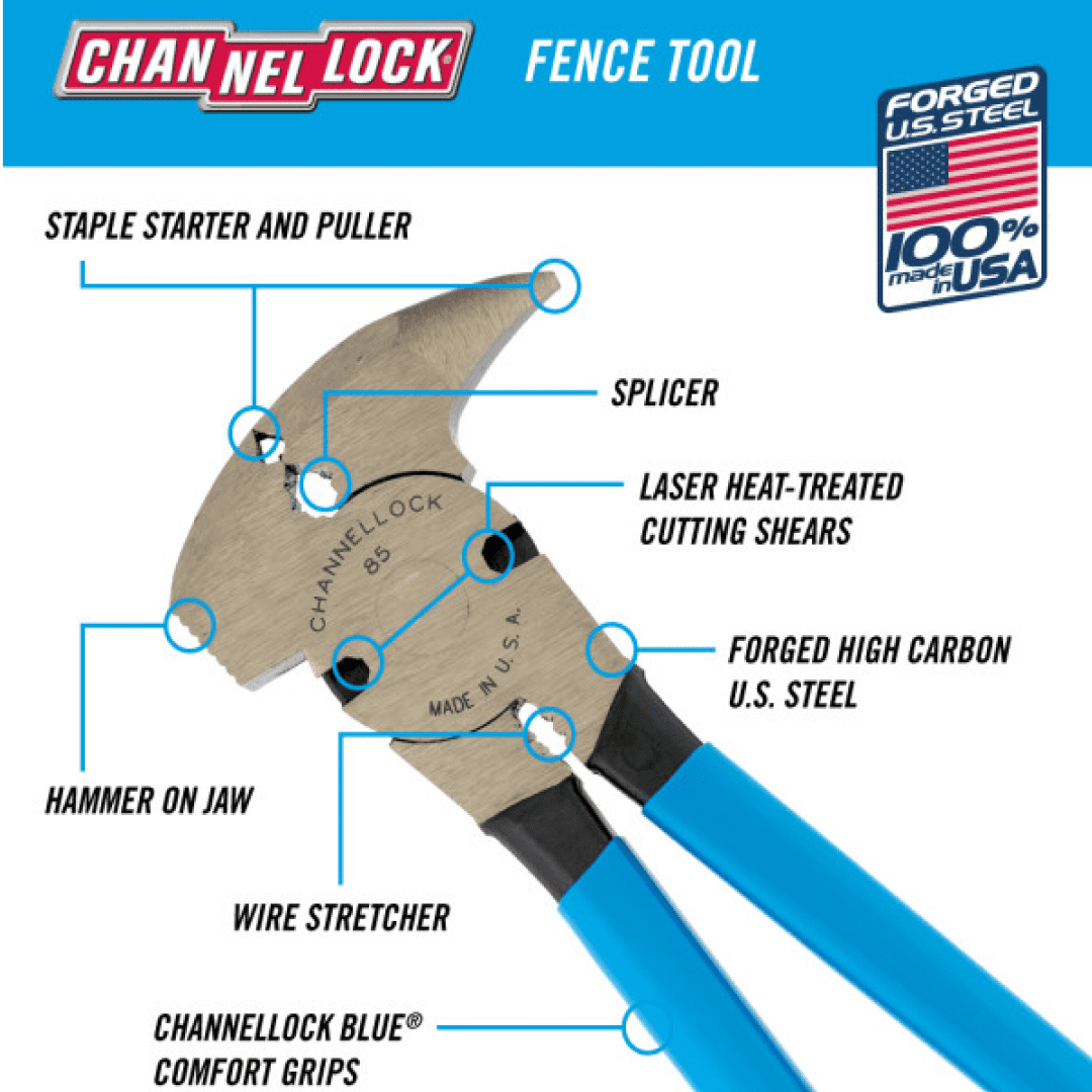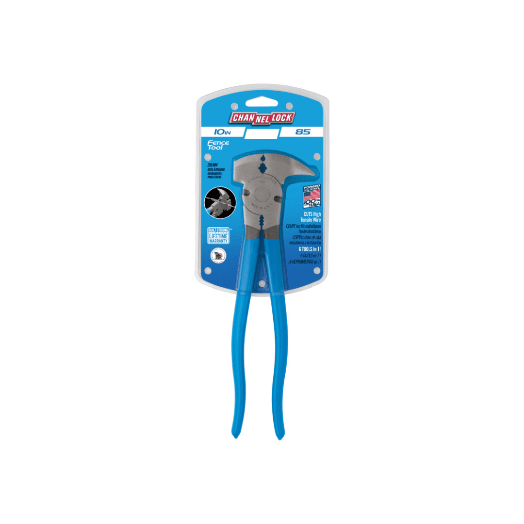 The CHANNELLOCK® 85 10-inch Fence Tool combines 6 features in 1 reliable tool for fencing installation, repair, and maintenance. CHANNELLOCK® uses laser heat-treating technology to harden two wire shears so you can cut High Tensile wire with ease and confidence. Other features of the CHANNELLOCK® Fencing Plier include a Hammer and Starter for staple install as well as a Claw plus Puller for staple removal and wire stretching. Also included, a precision-machined Crimping nest and Wire Splicer. The CHANNELLOCK® model 85 Fence Tool is 100% Made in USA and Forged from High-Carbon U.S. Steel. Hardworking Tools, made by harder working Americans.