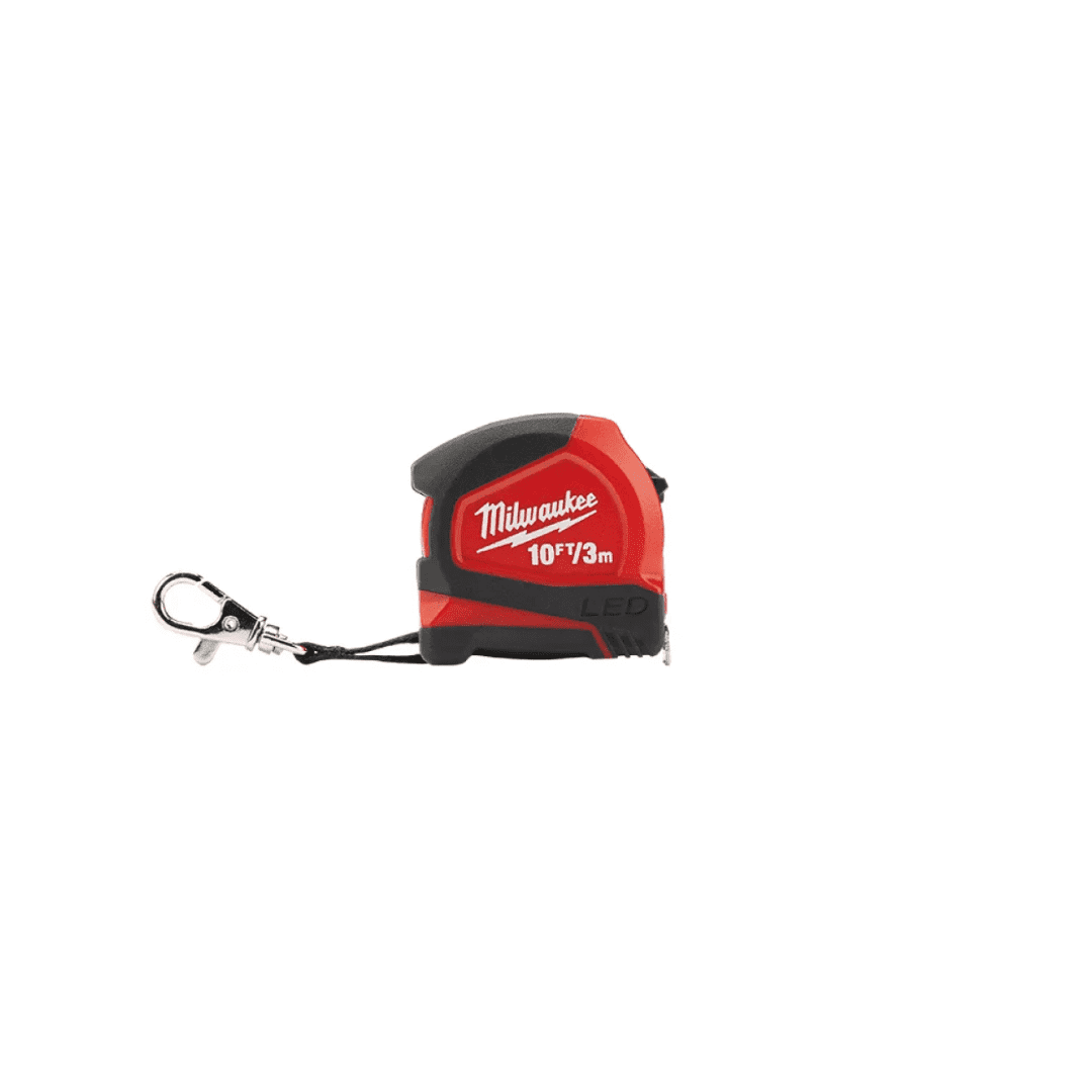 10ft/3m Keychain Tape Measure with LED features an LED Light to help users more easily read measurements in low light conditions. A 4-point reinforced frame protects against damage from dropping. For added functionality the tape measure is equipped with a magnetic back for storage. A secure, heavy duty keychain clip gives it the versatility to clip onto almost anything – from belts to key rings. Like all MILWAUKEE® tape measures, it’s backed by a limited lifetime warranty.