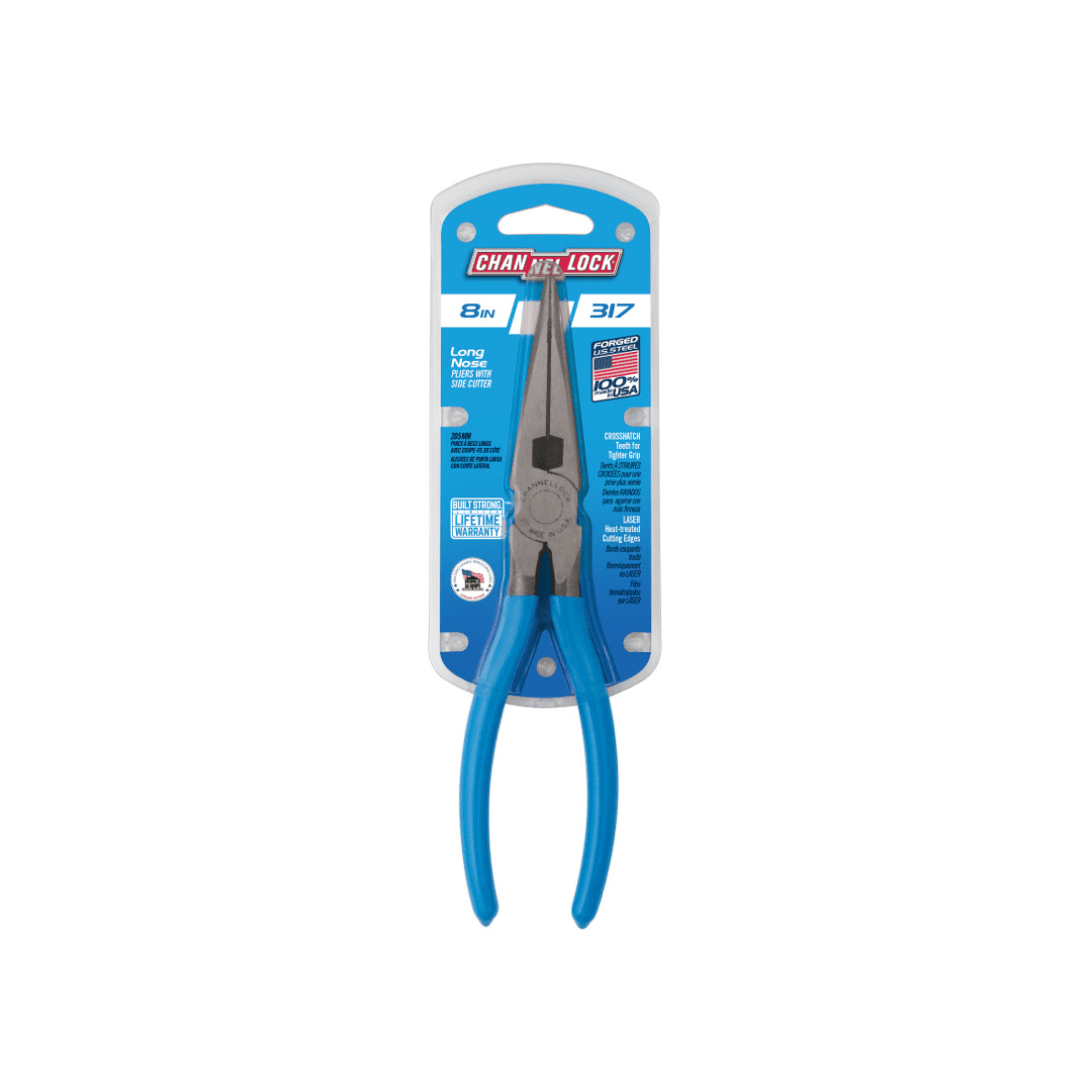 CHANNELLOCK® Long Nose Pliers feature a crosshatch teeth pattern providing a maximum grip and a narrow nose profile that delivers extra precision in hard-to-reach areas. A precision-machined knife and anvil style cutting system ensures perfect mating while state-of-the-art laser heat treating offers a strong and consistent pattern across the cutting edge, adding increased strength and longevity over traditional hardening practices. CHANNELLOCK® Long Nose Pliers are made in USA and forged from high carbon U.S. steel that is specially coated for ultimate rust prevention.