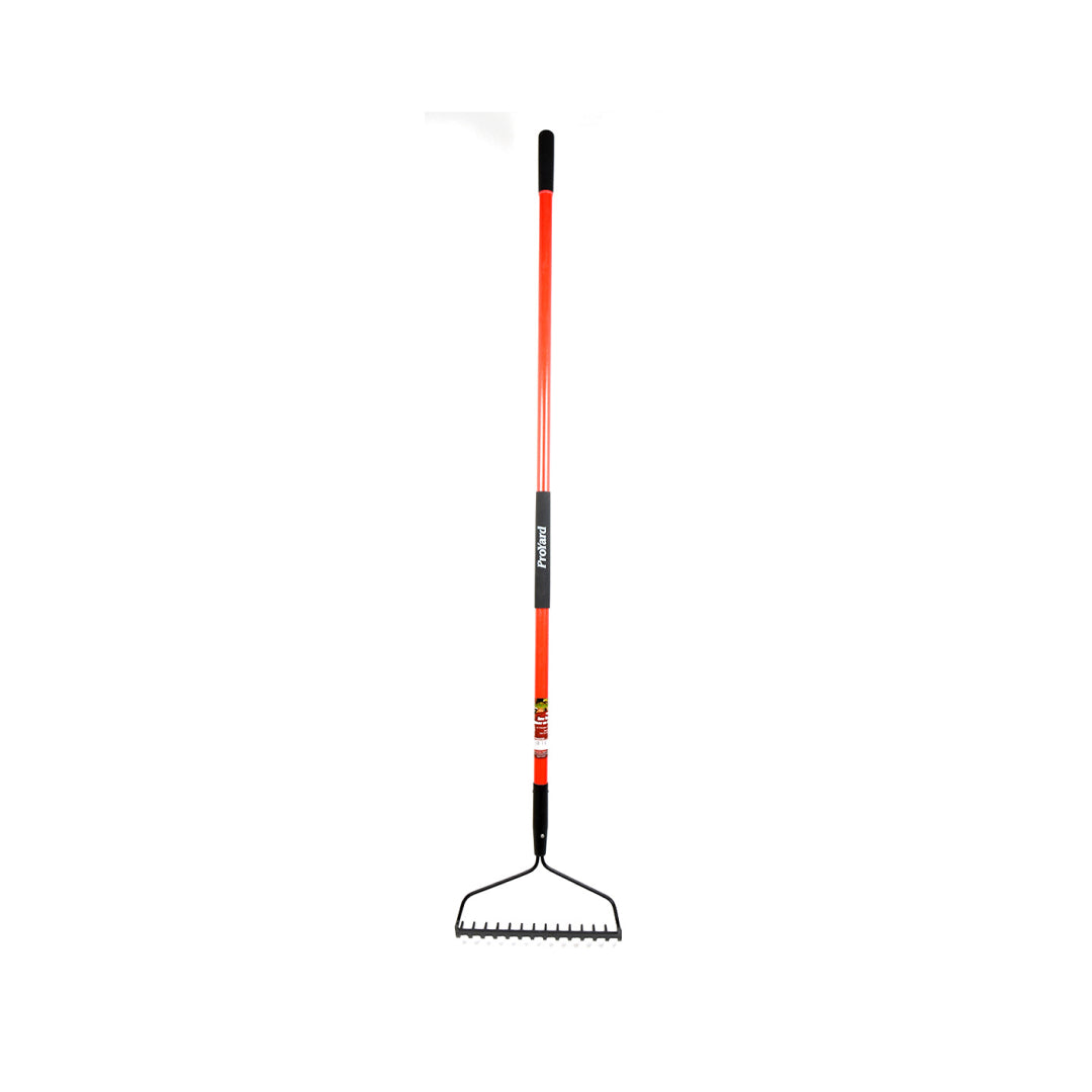This contractor grade bow rake is designed with 14 hardened steel tines and a long fibreglass handle making it strong and durable. It has also been outfitted with cushion grips to lessen vibrations and hand fatigue. Perfect for professionals and homeowners alike, this tool is ideal for loosening compact soil, spreading mulch or hay, collecting leaves or grass and leveling areas before planting.