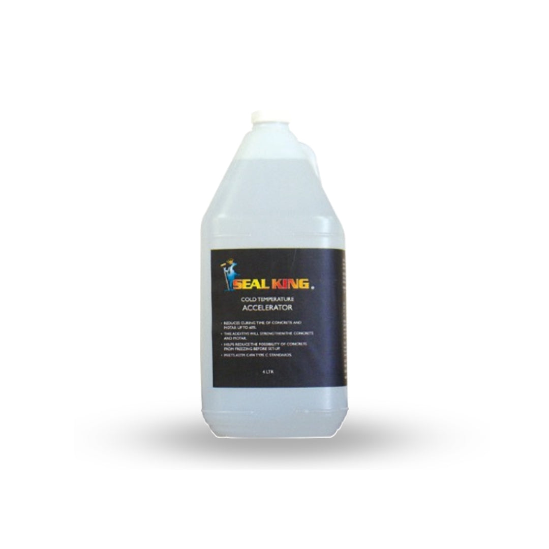 Seal King’s Cold Temperature Accelerator is used to speed up set times for concrete and mortar during cold weather. It can reduce curing time of concrete and mortar by up to 60% and help strengthen the concrete and mortar. Cold Temperature Accelerator also help reduce the possibility of concrete from freezing before set-up.