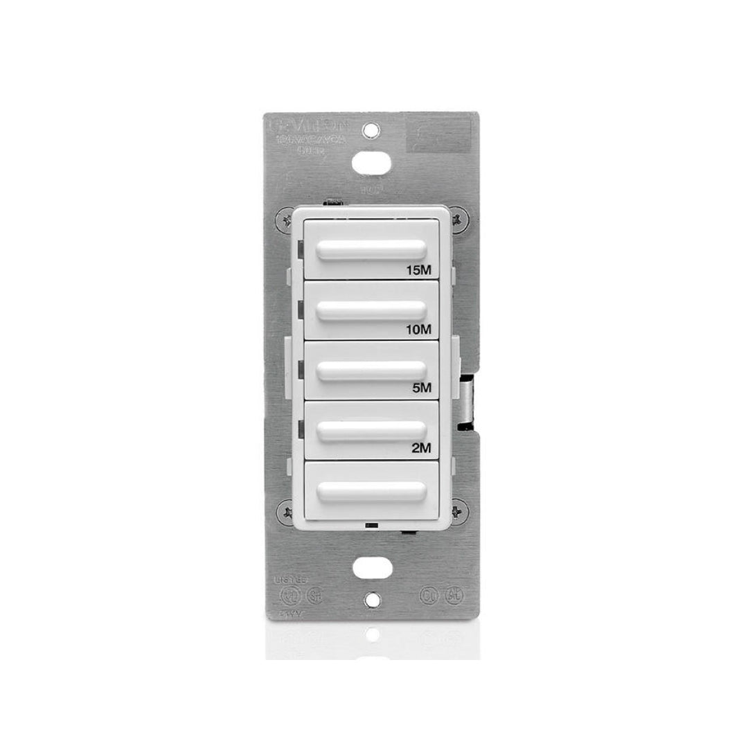 Decora Countdown Timer, 120VAC, 60Hz, 1800W Incandescent, 600W CFL, 5A LED, 20A Resistive/Inductive, 1HP, Single pole, 3-way or more locations (with VP0SR). Has four preset buttons for 2 minute, 5 minute, 10 minute and 15 minute countdown timers. Neutral required - White, with Ivory and Light Almond color change kits included. The LTB15-1LZ, Leviton Decora Timer Switch offers advanced features, superior accuracy and contemporary aesthetics. It provides convenient timed control of lighting and motor loads in homes, offices, schools, libraries and other small commercial applications. It is ideal in automating control of heat lamps, hot tubs, attic and exhaust fans. This timer allows users to simply press and hold the top button to initiate override or press and hold two buttons to convert the 15-minute timer into other available time intervals. It has soothing green LED locator lights and offers three colors in one box, plus single pole or 3-way capability (with VP0SR).