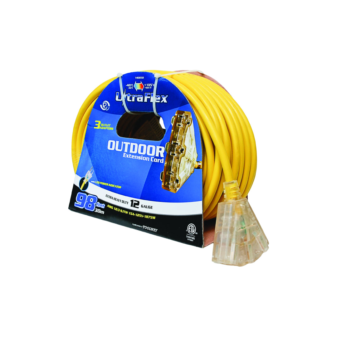 Ultraflex outdoor extension cords by Toolway are perfect for all job sites and working conditions. These heavy-duty cords have connector ends that light up which allows you to see if there is power going through them from a distance. The Durable PVC jacket resists moisture while allowing the cable to remain flexible and prevent cracking in arctic cold or melt in desert heat. The Yellow durable PVC jacket provides high visibility on job sites; while the Lit 3-outlet fantail serves as a power indicator while offering more outlets on the job. Can be used with chain saws; wet/dry vacuums; orbital sanders; and outdoor equipment."